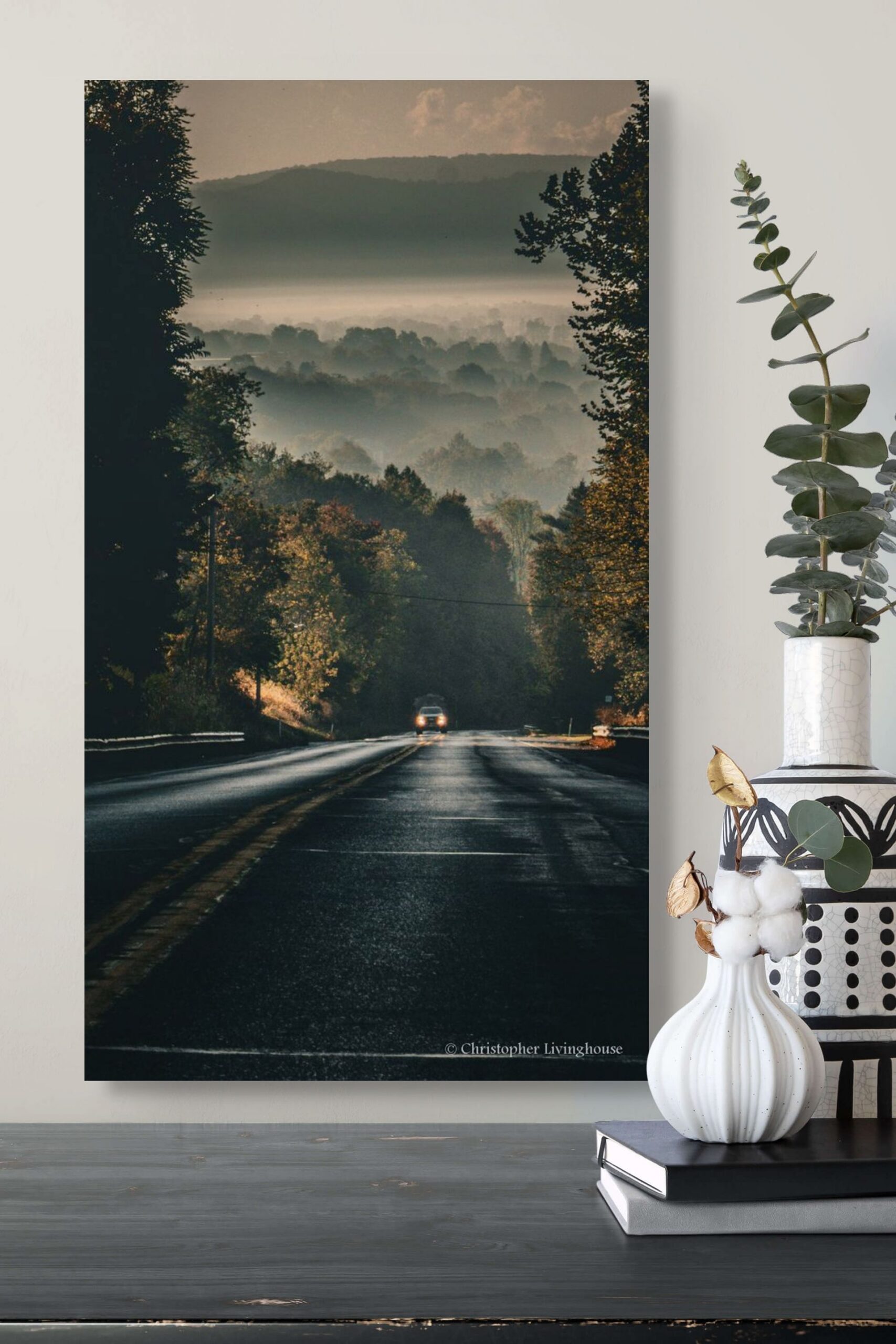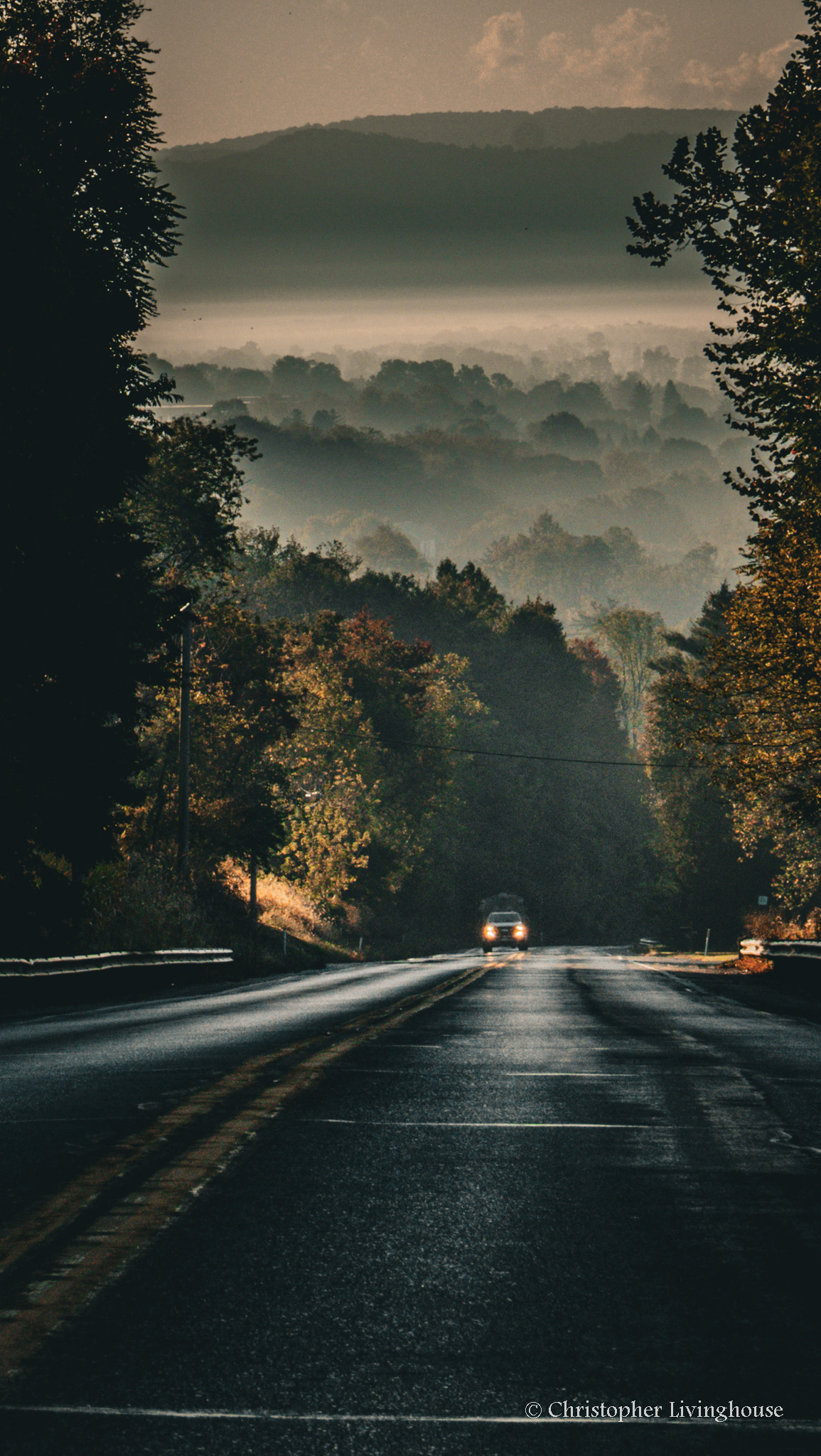 This picture was taken on a chilly Pennsylvania morning. As you look down the windy road, you can see fog lingering around the trees of the Oley Valley. The image of the pickup truck with its headlights on, ascending the road, gives the picture additional depth.